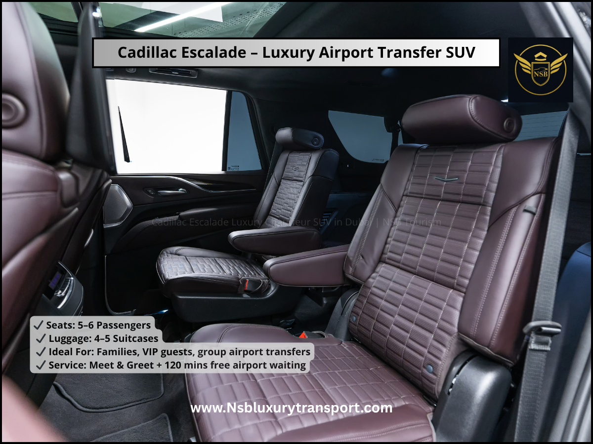 Travel in unmatched luxury with our Cadillac Escalade Airport Transfer Service in Dubai. This premium SUV is designed for those who expect space, comfort, and a powerful road presence. Whether you are arriving at Dubai International Airport or heading to your hotel, our professional chauffeur ensures a smooth, stress-free journey.